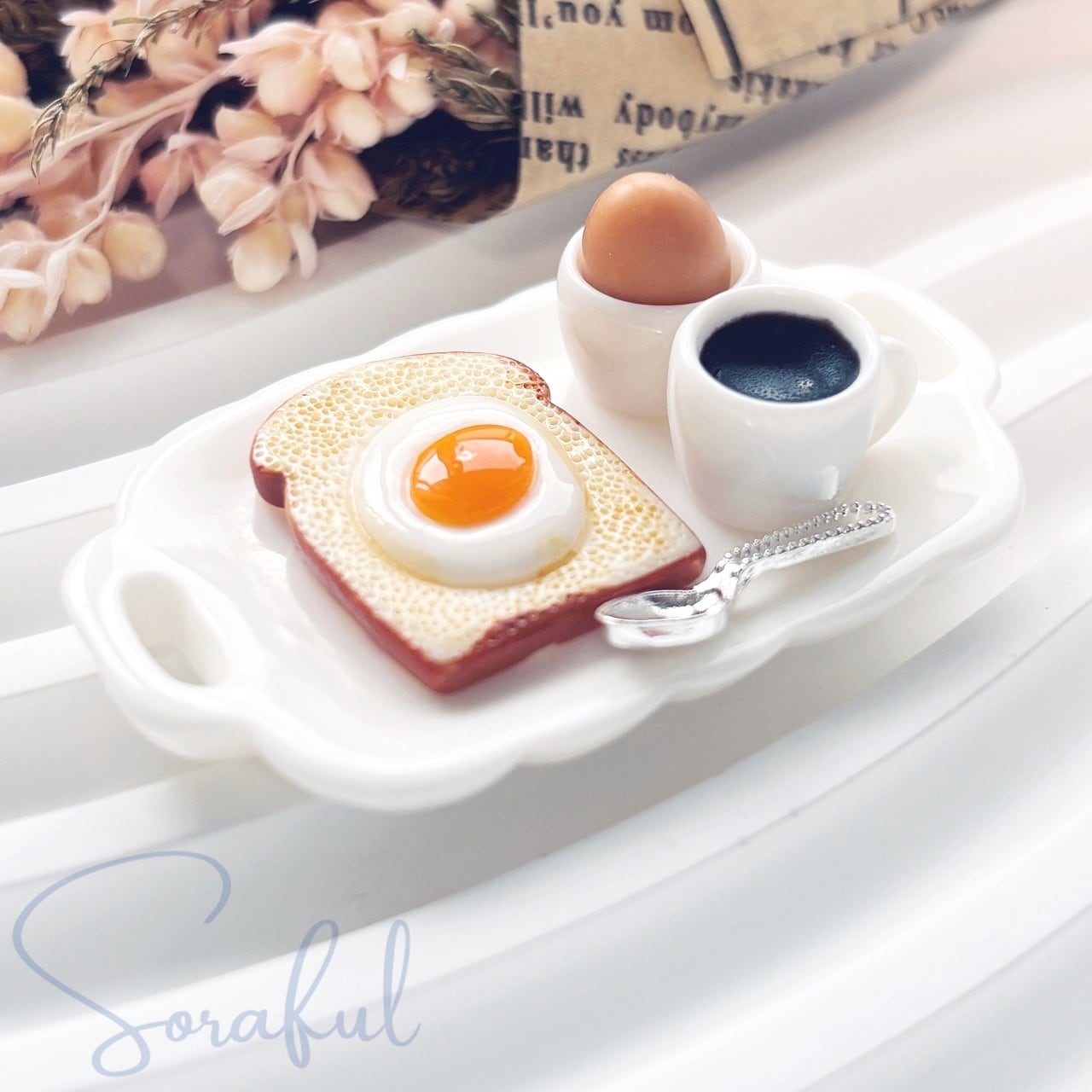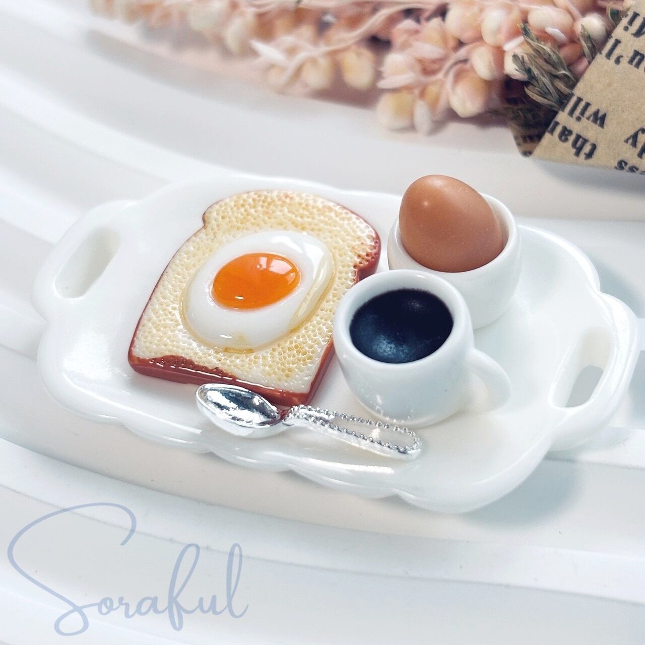 目玉焼きのせトースト、コーヒー、卵、カップ、スプーン、トレー