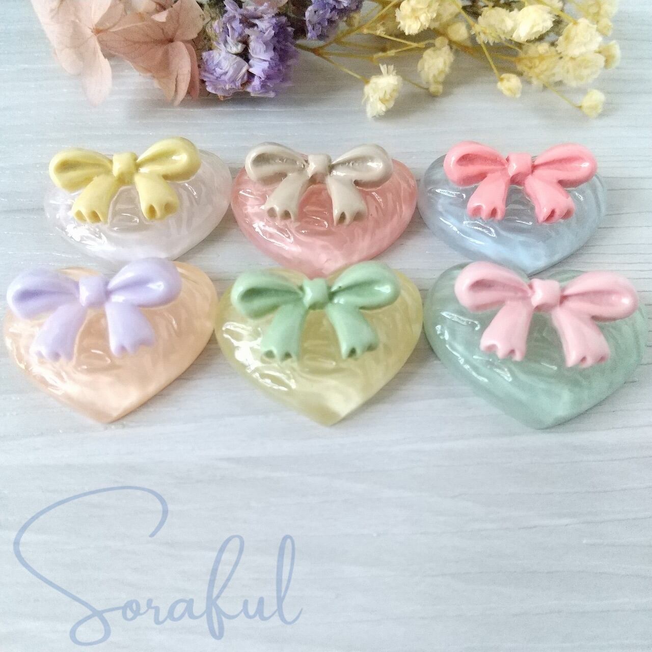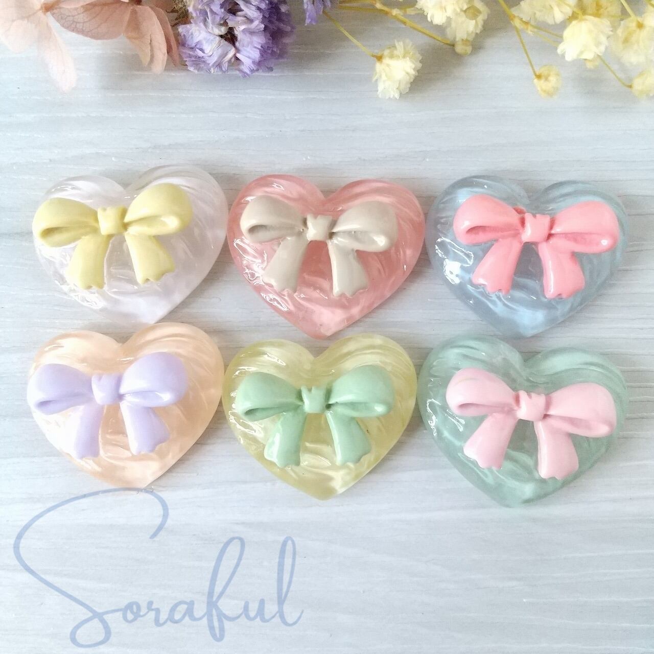 【6色セット】リボン付きクリスタルハート クリアカラー【デコパーツ】D-0225