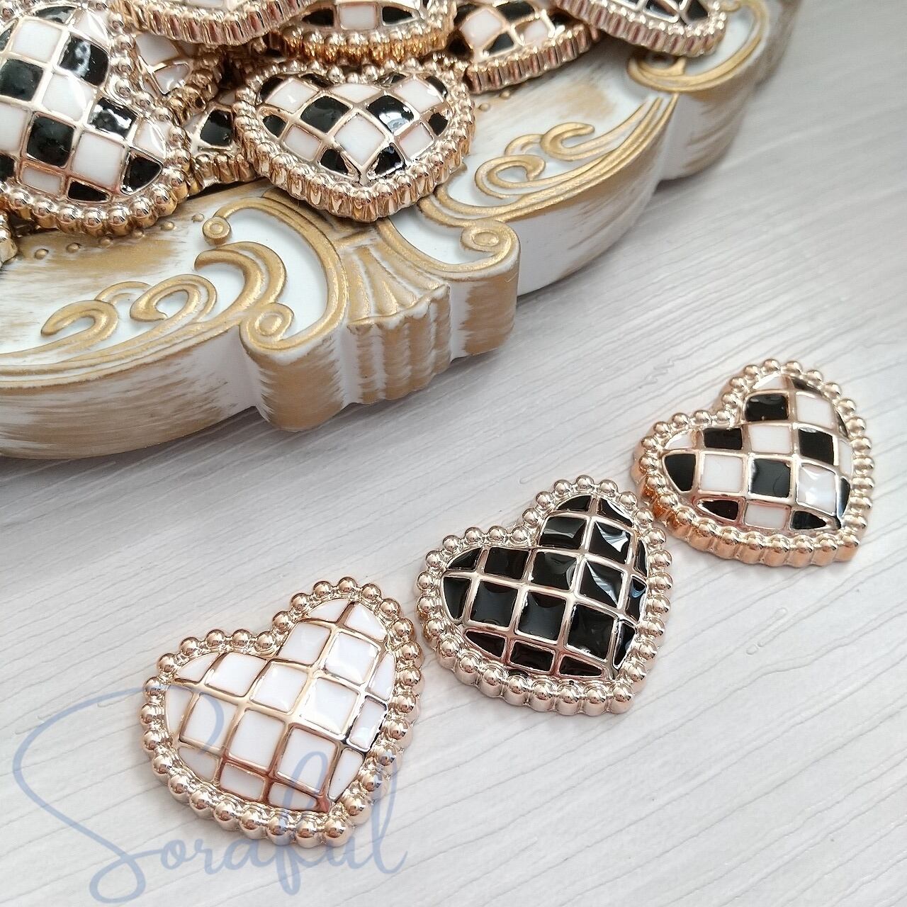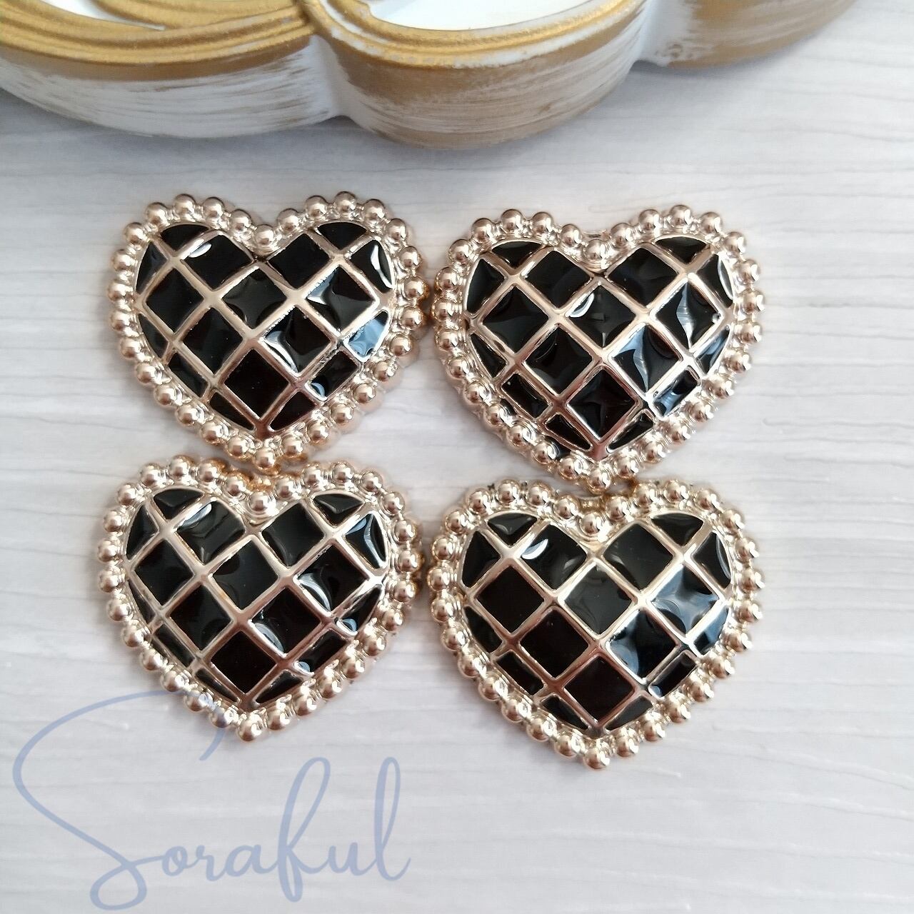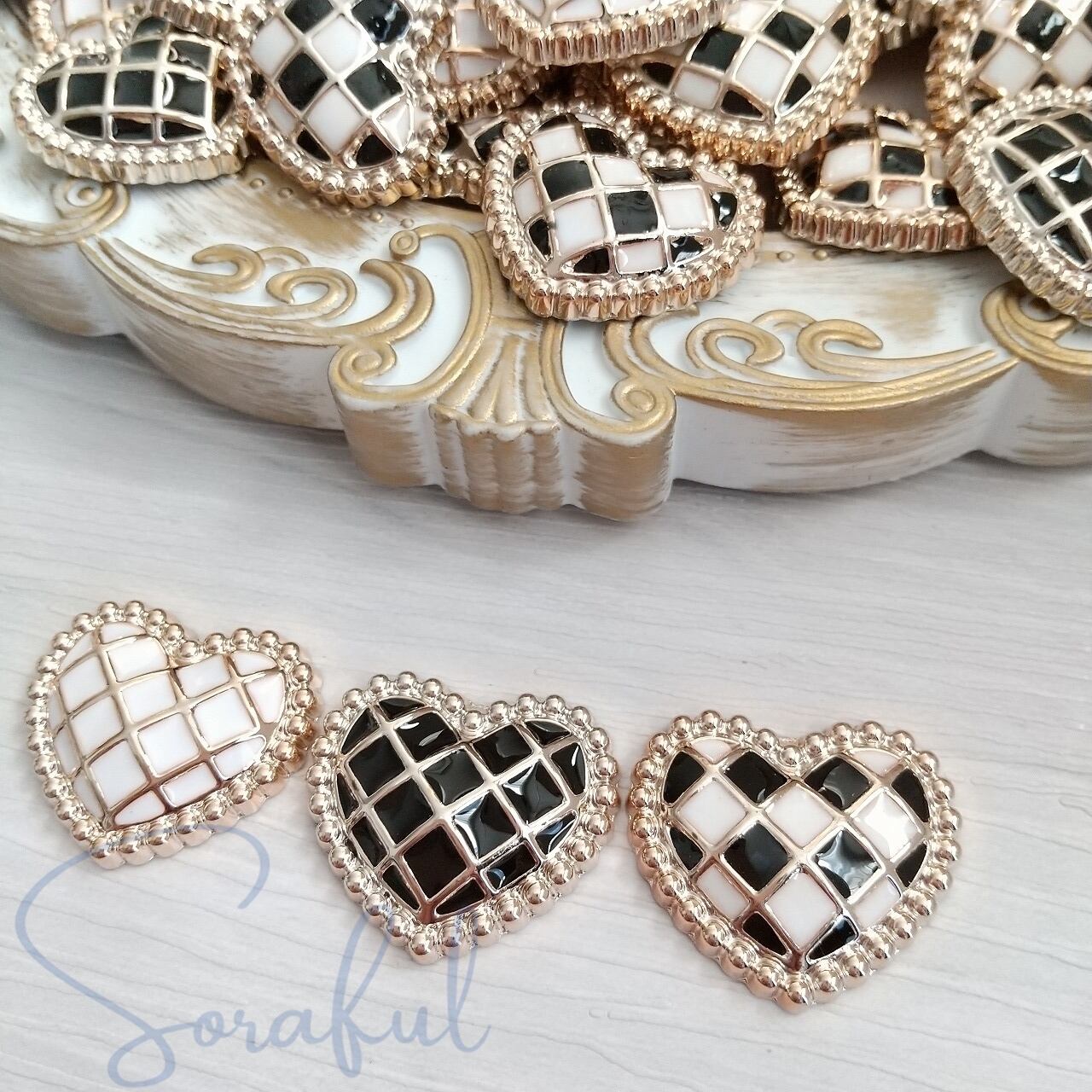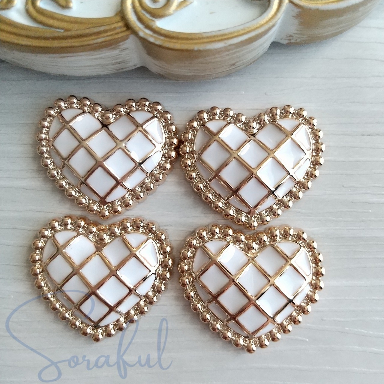 【4個】大人可愛い格子柄ハート モノトーン バイカラー【デコパーツ】D-0537