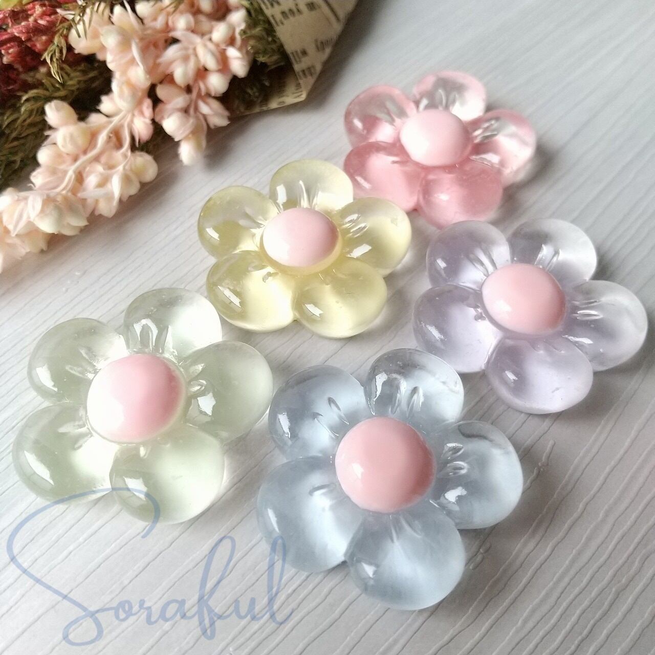【4個】クリアカラーのぽってりフラワー 花【デコパーツ】D-0635-4