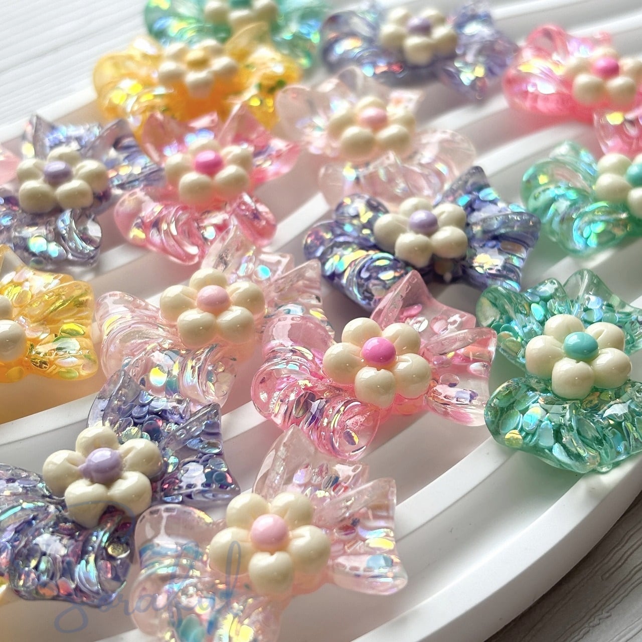 【5色セット】クリアなお花のリボン キラキラ スパンコール【デコパーツ】D-0700