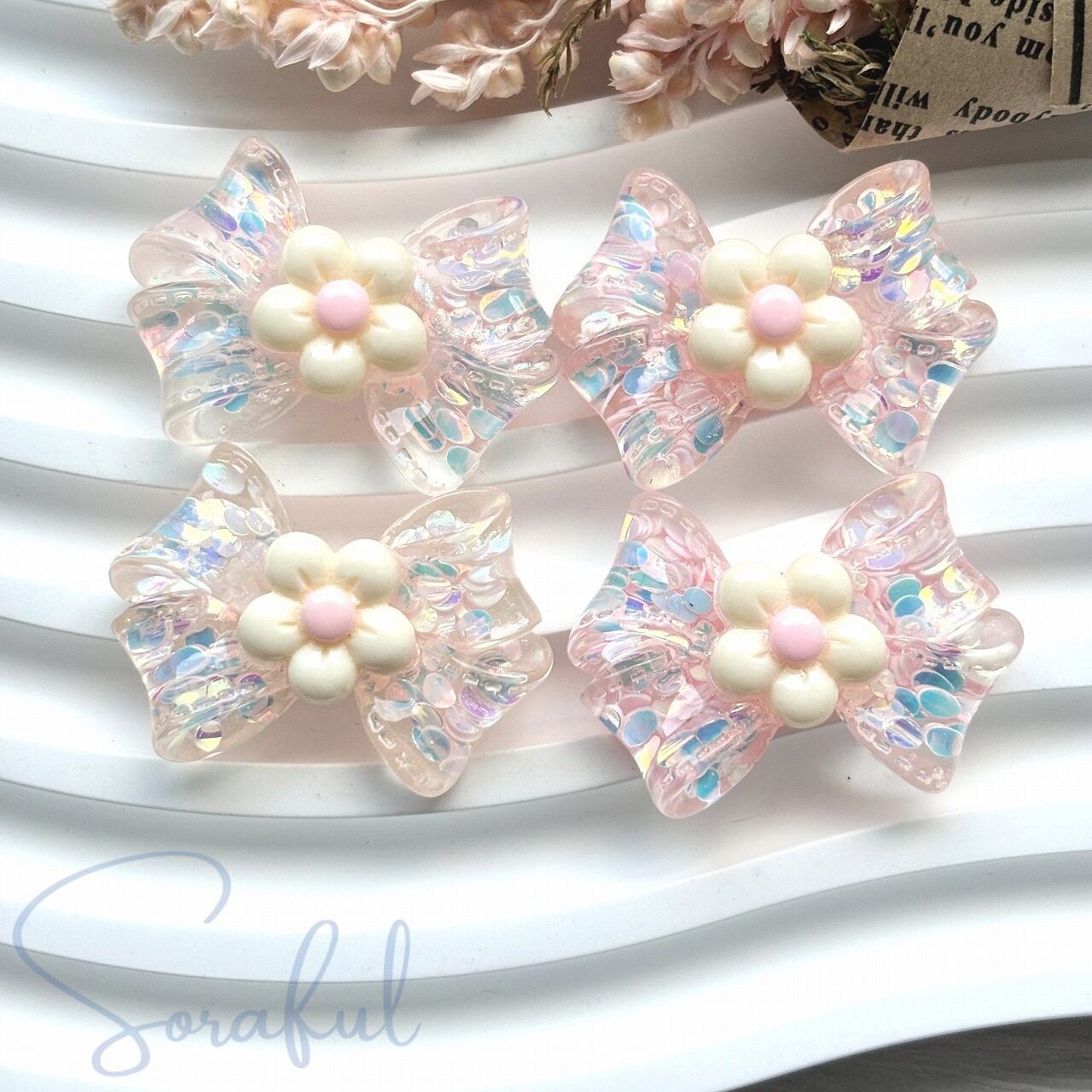 クリアなお花のリボン キラキラ スパンコール 4個
